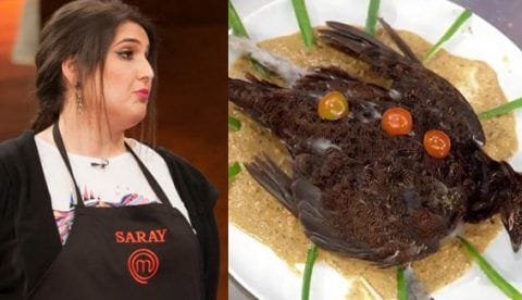 Saray le entregó al jurado una perdiz muerta cruda y con todas sus plumas adornada de hojas y rodajas de tomate cherry bajo el nombre pájaro muerto en lo alto de un plato. Esto generó indignación en los miembros que lo recibieron y la inmediata decisión de expulsar a la participante.