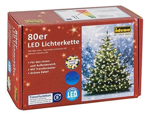 - Cadena de luces decorativa con 80 LEDs en color de luz blanco cálido (temperatura de color 2700k), con enchufe y transformador, longitud total aprox. 15,9 m (de los cuales aprox. 8 m de cable de alimentación), apta para uso en interiores y exteriores